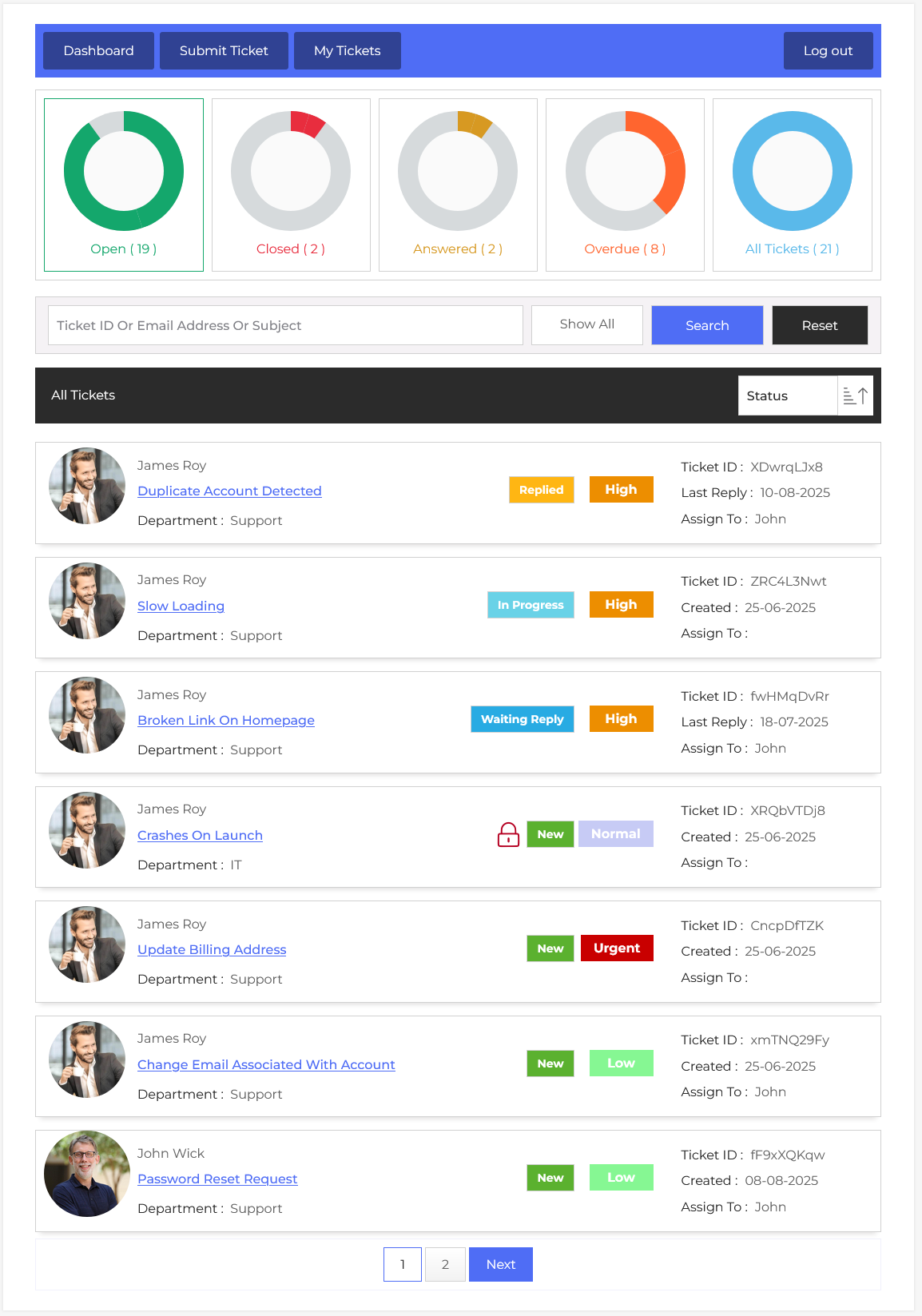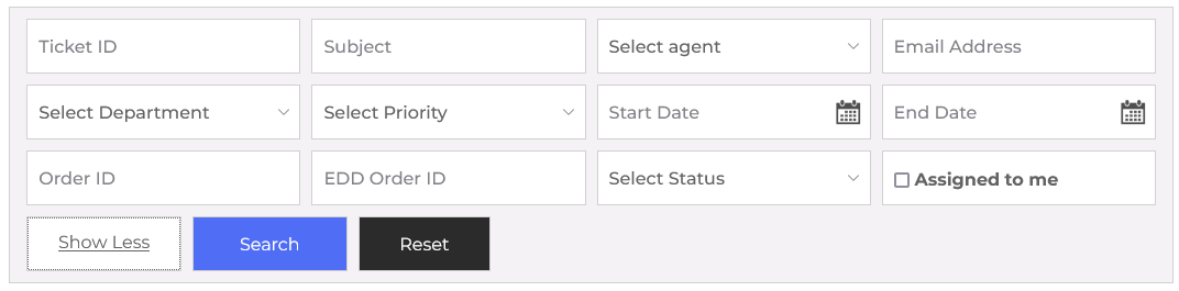 If the agent clicks on the “Show All” button on the right side, all search fields will appear on the screen, which is a comprehensive search on my listing page. It can be used to find tickets with any specific criteria. Agent filters tickets by Ticket ID, Subject, Select Agent, Email Address, Select Department, Select Priority, Start Date, End Date, Ticket Status, and Assigned to me. The agent can define criteria using the search fields and click on the search button, then only the tickets that fulfill the agent-specified criteria will be visible in a listing. The reset button will disable the criteria and show all tickets. The fields and the titles can be controlled from the field ordering.