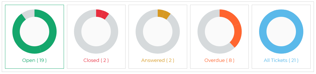 There are five buttons, each button has a title and the number of tickets. The button titles are open, closed, answered, overdue, and all tickets. Clicking on any of the five buttons will show those specific tickets on the page.