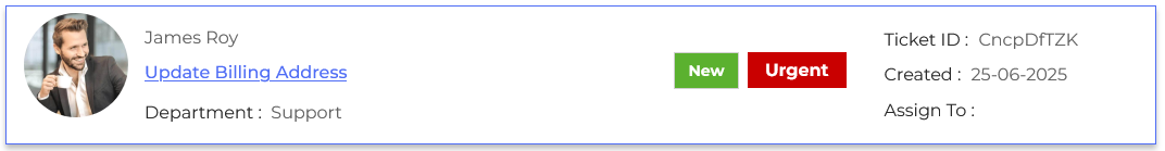 This portion represents a single ticket; it has a photo, from, subject, department, ticket status, ticket ID, created, assigned to, and priority of a ticket. Clicking on the subject of a ticket will go to the ticket detail page.