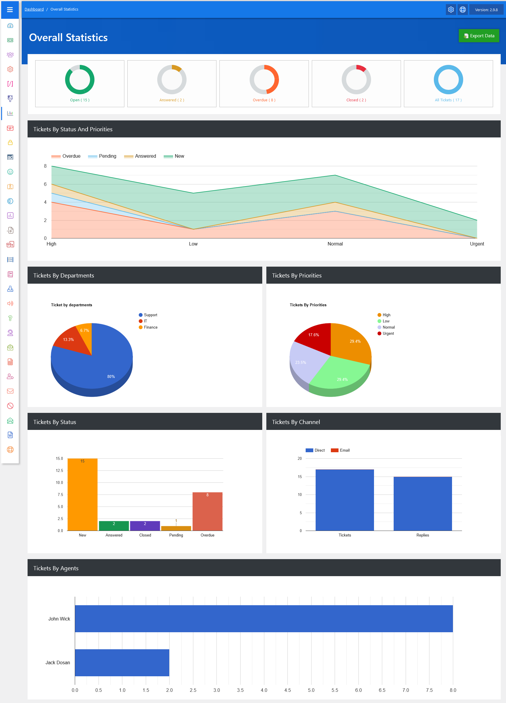 Additionally, there’s an option to “Export Overall Statistics Data” at the top right of the “Overall Statistics” page. The Export Data feature in JS Help Desk allows you to quickly download your help desk ticket’s information in a structured file format, making it easier to back up, share, or analyze your records outside the system. This is especially useful for reporting.