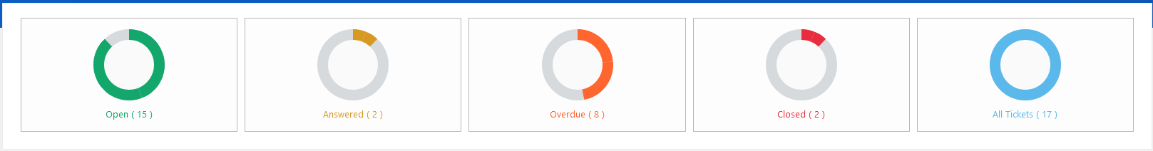 At the top of the dashboard, you’ll see quick status indicators showing the number of Open tickets, Answered, Overdue, Closed, and the total All Tickets count. For example, if you see 15 tickets open, 8 overdue, and 2 closed, it immediately tells you there’s work pending and some items requiring urgent attention.