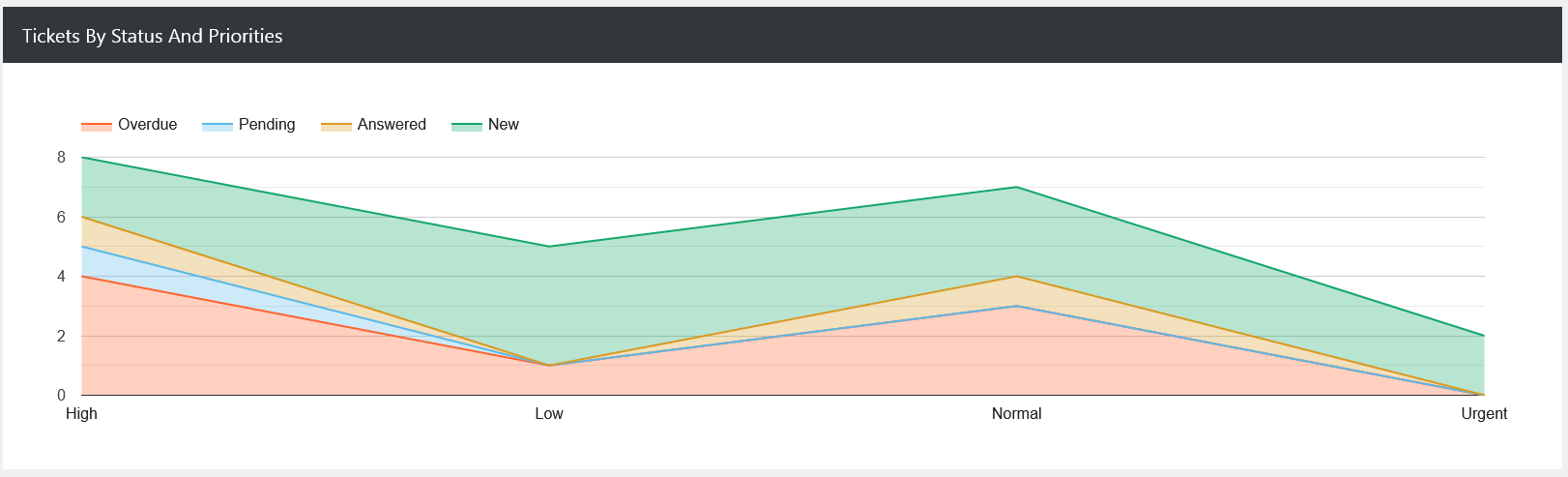The Tickets by Status and Priorities chart offers a layered view of how tickets are distributed across statuses such as New, Pending, Answered, and Overdue while also mapping them against their urgency levels: High, Low, Normal, and Urgent.