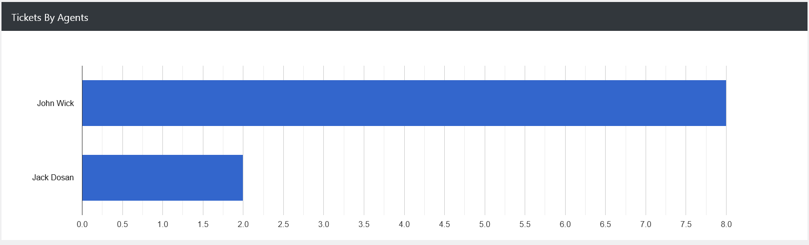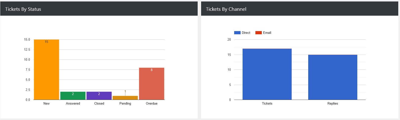 The Tickets by Status bar chart gives a clear count of how many tickets are New, Answered, Closed, Pending, or Overdue. If you have 15 new tickets and 8 overdue, but 2 answered, it may indicate a response delay, prompting managers to check team workloads or processes.