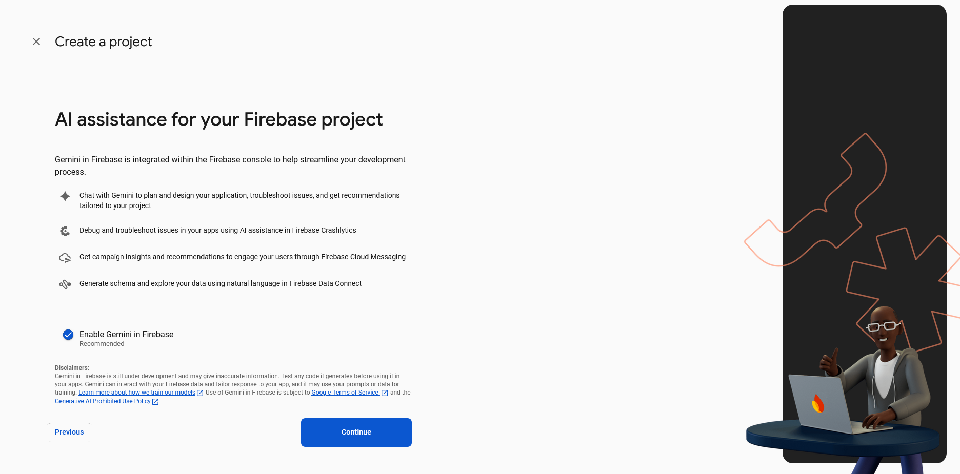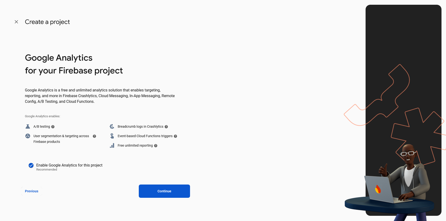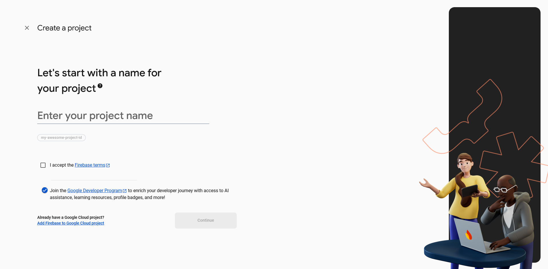 Enter your project name and accept the Firebase terms, and then click on the continue button.