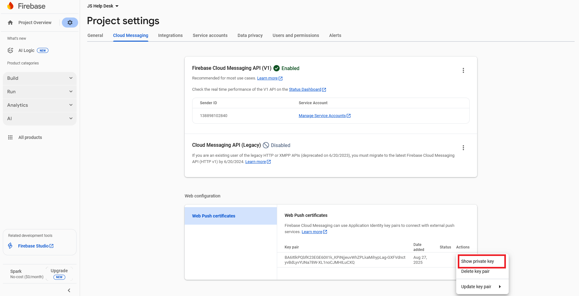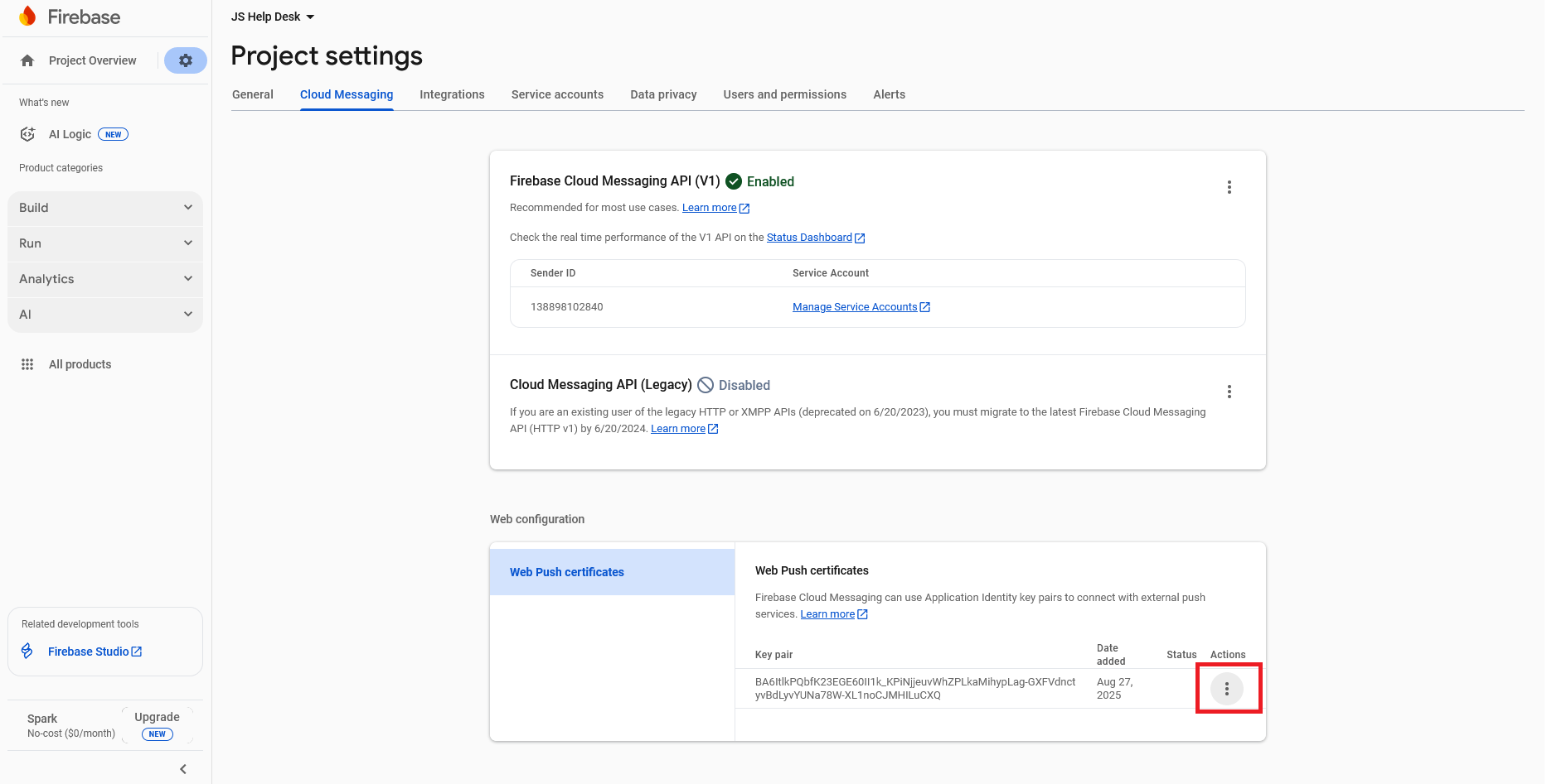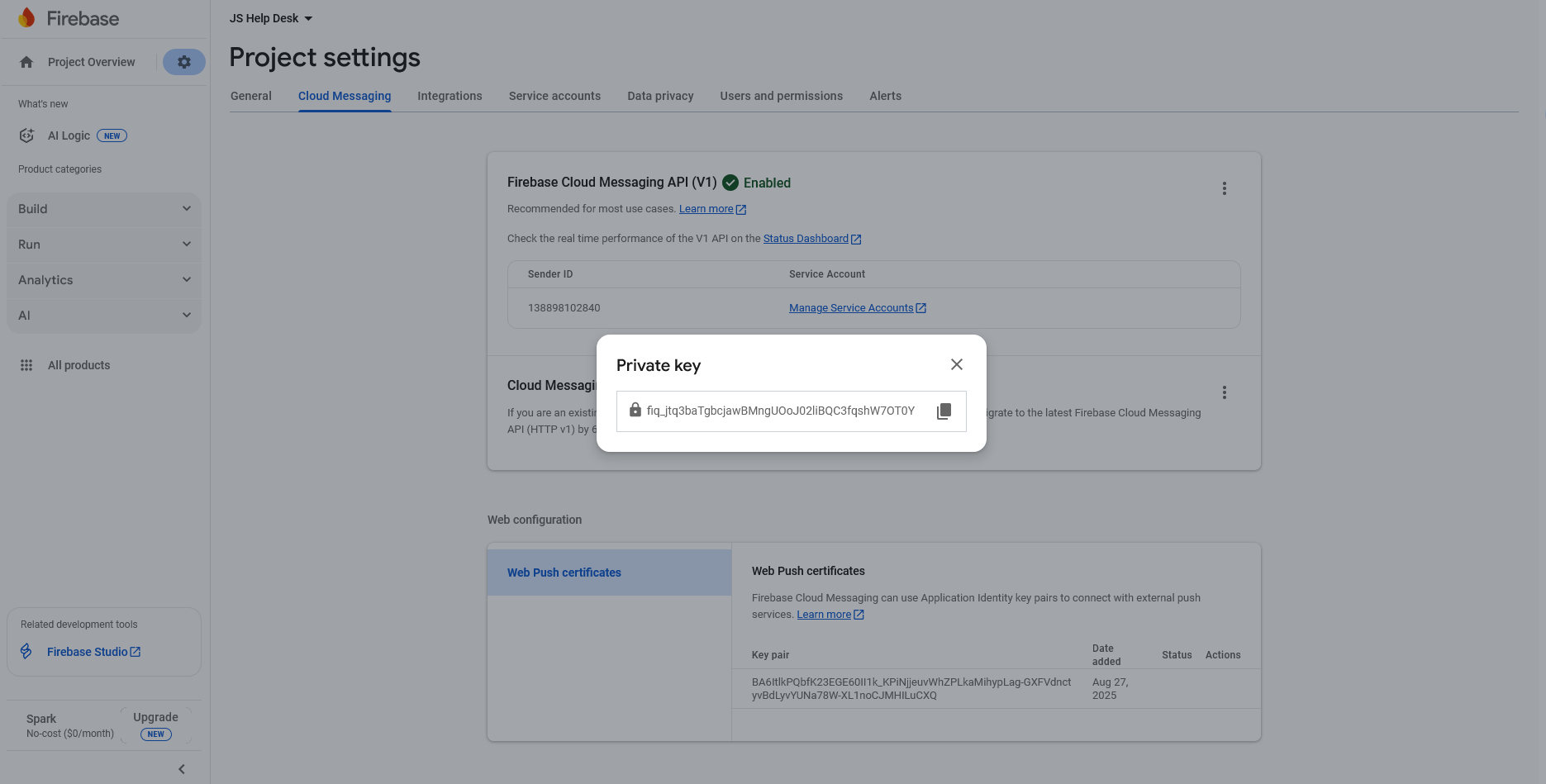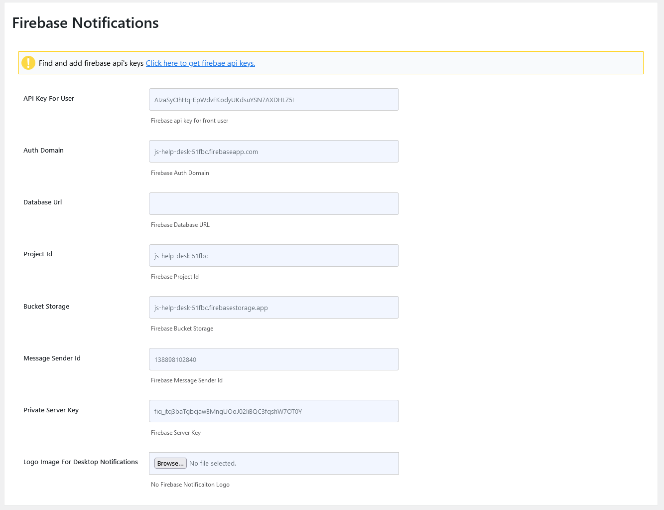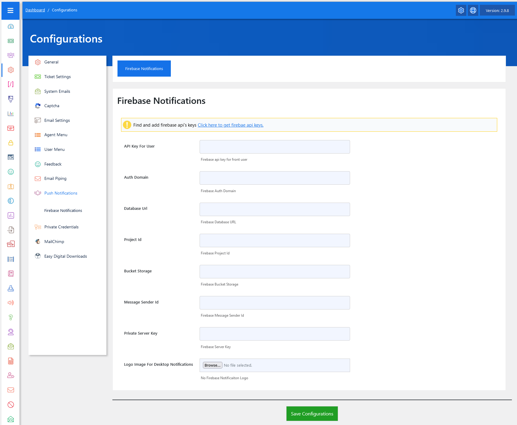 Use the data from steps 10 and 13. After filling in the Firebase Notifications configurations, click on the save configuration button.