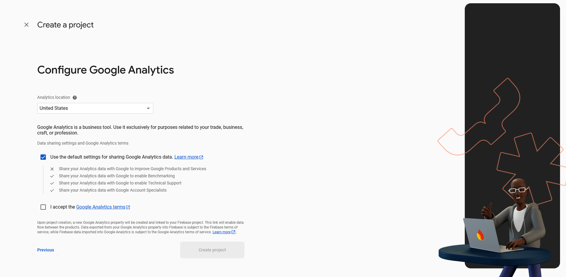 Select the Analytics Location from the combo box. Accept the Google Analytics Terms and then click on the Create Project button.