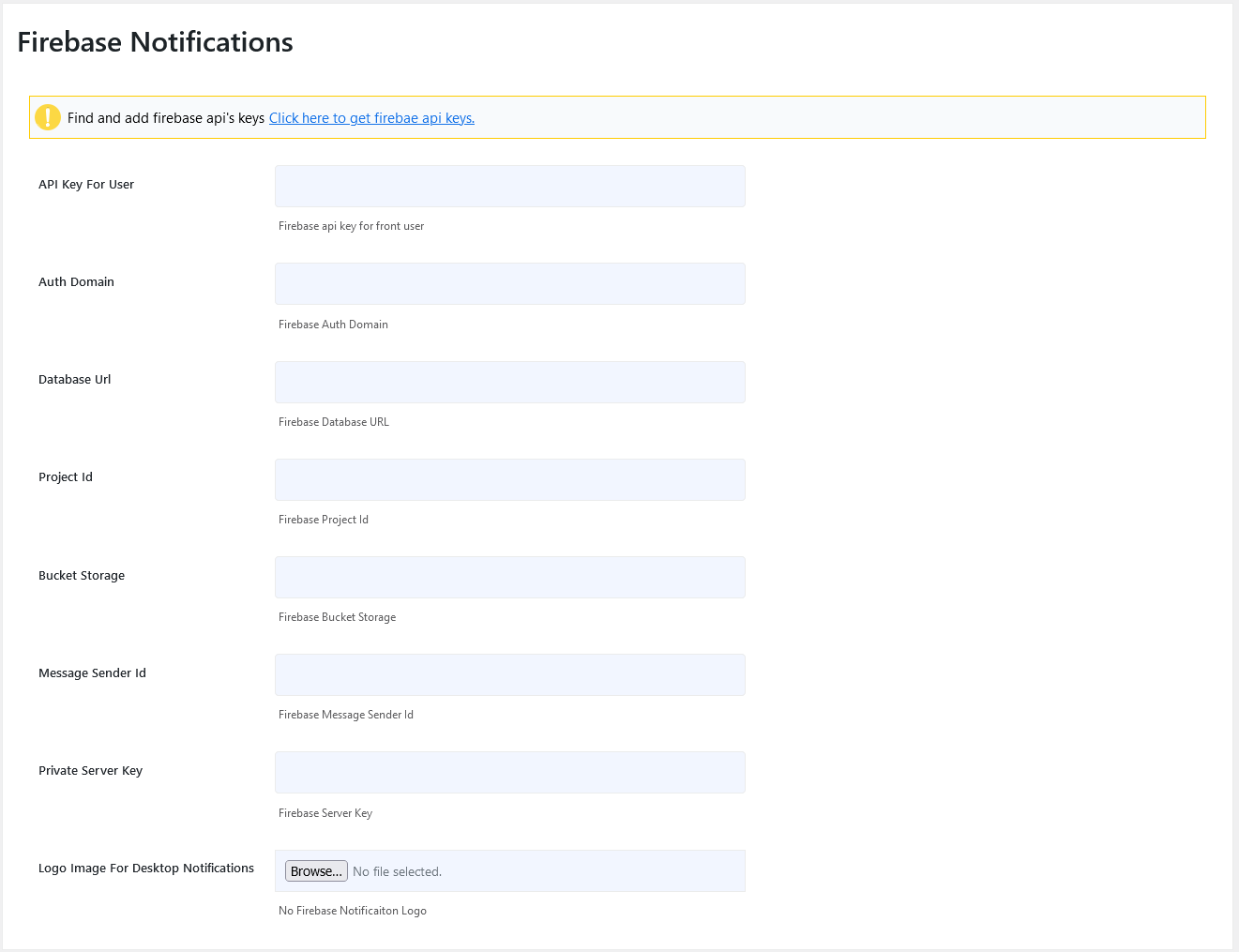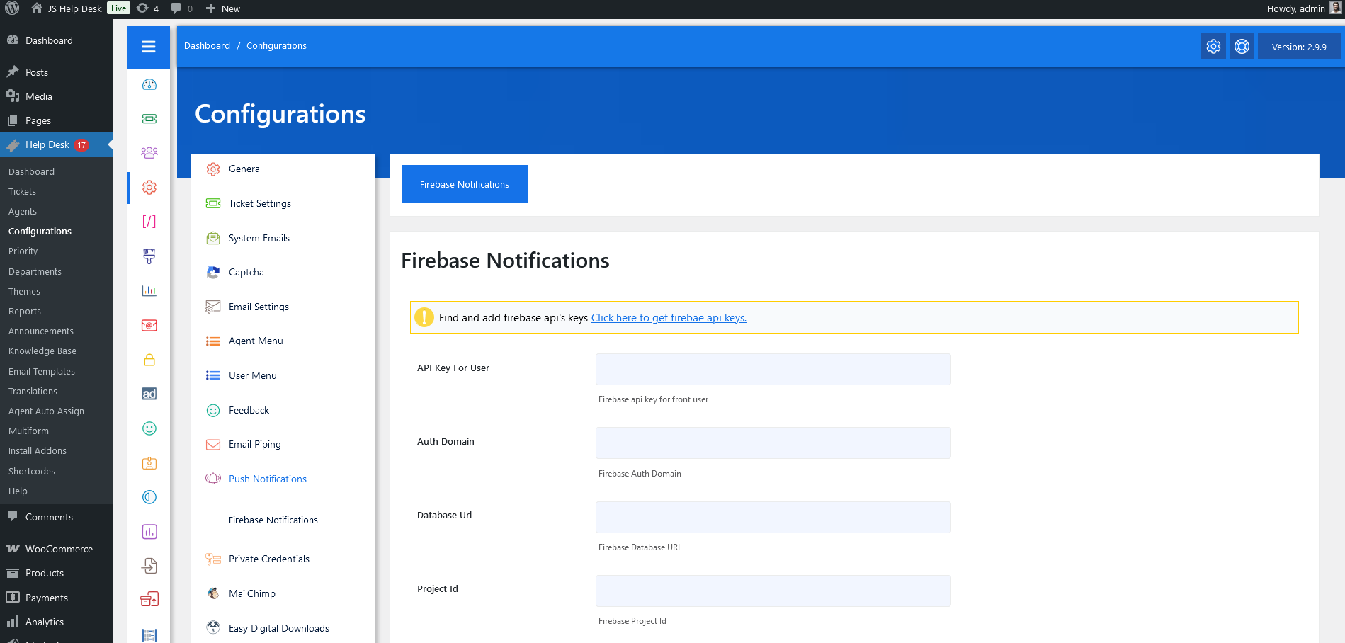 As an administrator, navigate to theĀ Admin Dashboard > Dashboard Menu > Configurations > Push Notifications. On the configurations page, you will find various configurations that the admin can use to manage the JS Help Desk push notifications.