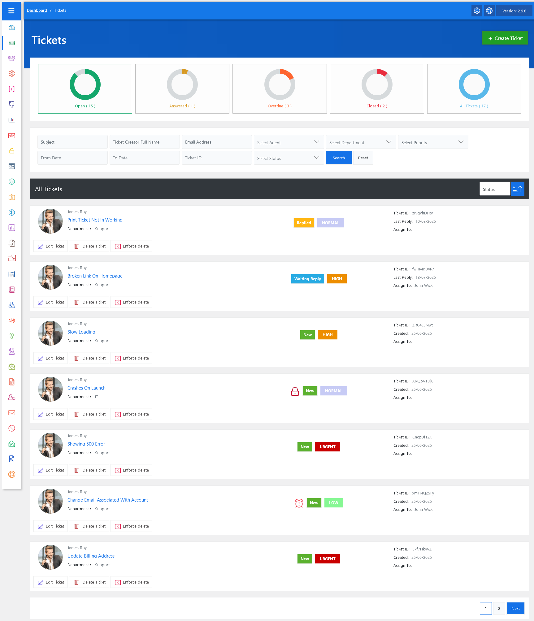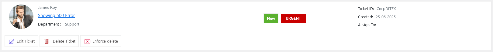 This portion represents a single ticket. It has the photo, subject, from, departments, ticket status, ticket ID, priority, assigned to, and created date for a ticket. There are also four buttons on the right side of the ticket bottom named Edit Ticket, Delete Ticket, and Enforce Delete.