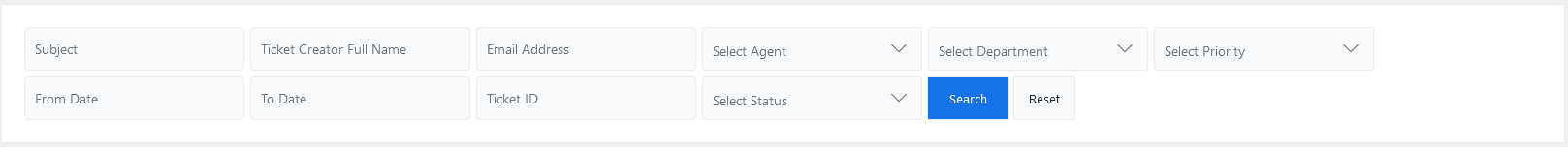This portion is a filter for my tickets listing page; it can be used to find tickets of any specific criteria. Admin filter tickets by subject, full name, email address, agent, department, priority, from date, to date, ticket ID, and ticket status. After filling criteria in the fields, click on the search button will show the ticket of that criteria. The reset button will disable the criteria and show all tickets.