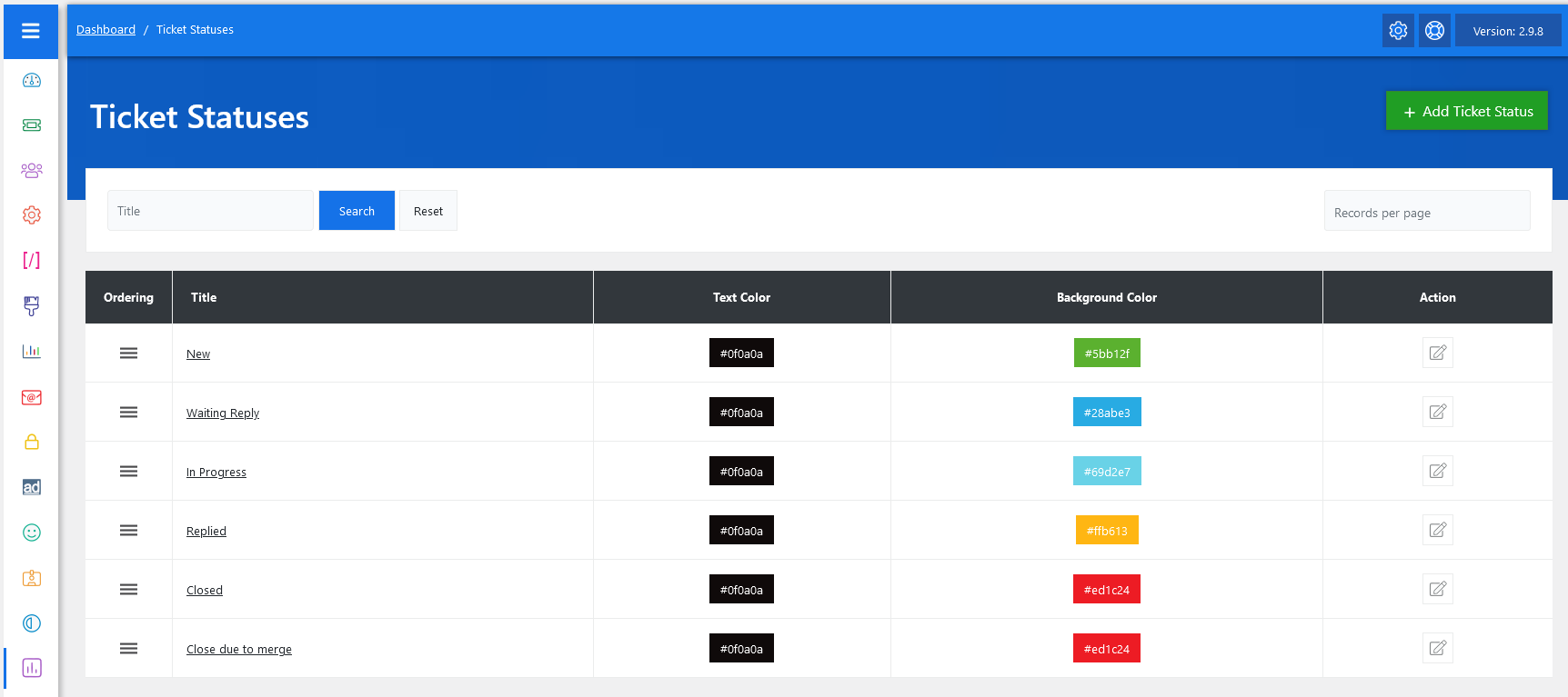 Administrators can fully customize ticket statuses to fit the organization’s workflow. Each status can be edited with a title, text color, and background color, making it easy to distinguish statuses visually on the dashboard. For example, “Closed” can be set to red for quick recognition, while “New” can appear in green to highlight incoming tickets. This visual cue system improves efficiency, especially when dealing with large volumes of support requests.