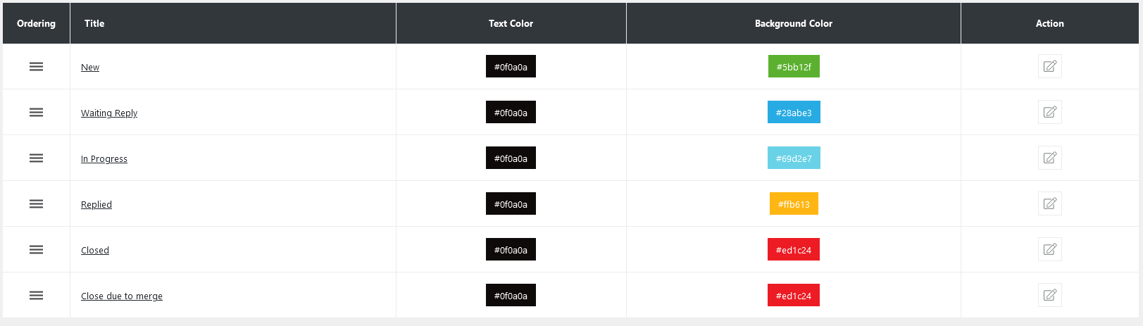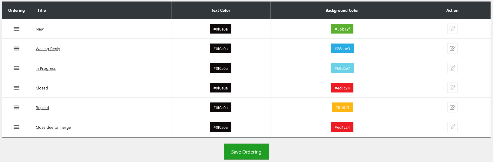 Admins also have control over the ordering of the priority using drag-and-drop functionality via the handle icon in the Ordering column. Additionally, there’s an option to “Add Ticket Statuses” at the top right of the “Ticket Statuses” page.