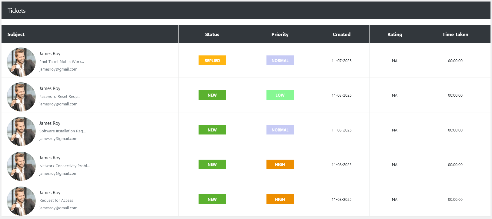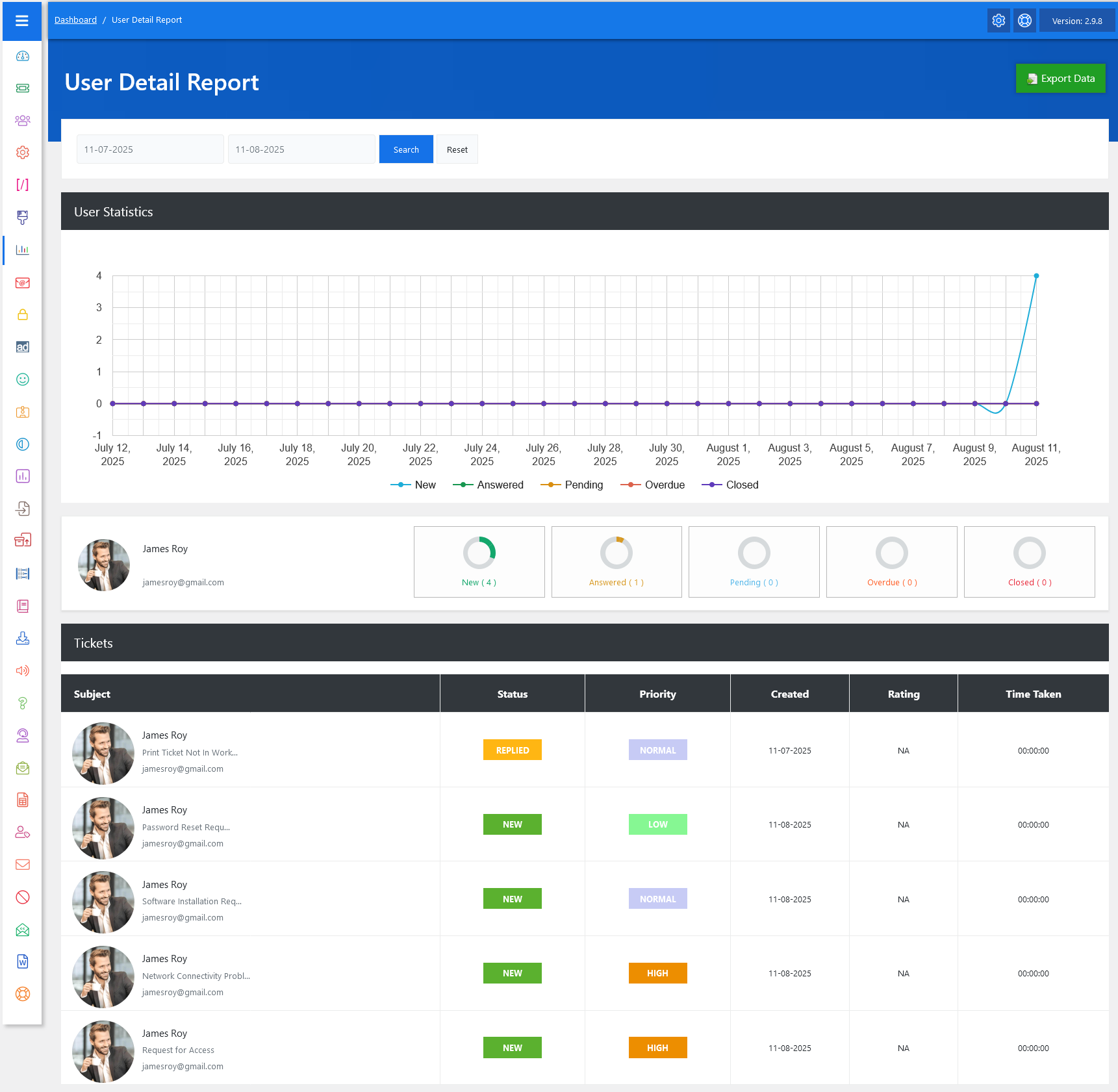 From your admin dashboard, navigate to Admin Dashboard > Dashboard Menu > User Reports. To view the user detail page, click on the user name. This page provides us with details about a user and their tickets. The User Detail Report feature in JS Help Desk provides a comprehensive view of all ticket activities and performance metrics for an individual user. By selecting a specific user, you can drill down into detailed statistics, making it easier to track performance and identify areas that may require attention. For example, if you choose “James Roy,” the system will display all tickets associated with him, categorized by their statuses such as New, Answered, Pending, Overdue, and Closed.