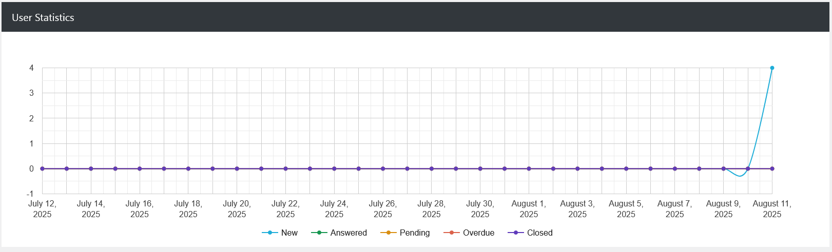 At the heart of this report is the User Statistics section, which presents a visual graph of ticket trends over time. Different colored lines represent ticket statuses such as New, Answered, Pending, Overdue, and Closed, allowing you to quickly spot activity spikes or inactivity periods.