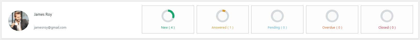 Below the graph, you’ll find a summary widget section that gives quick, at-a-glance figures for ticket counts in each status category. You will find the user’s profile details, including their name, photo, and email address. This personalized display makes it easy to confirm which user’s data you are reviewing. The status counters next to the profile, Open, Answered, Pending, Overdue, and Closed, show exact ticket counts.