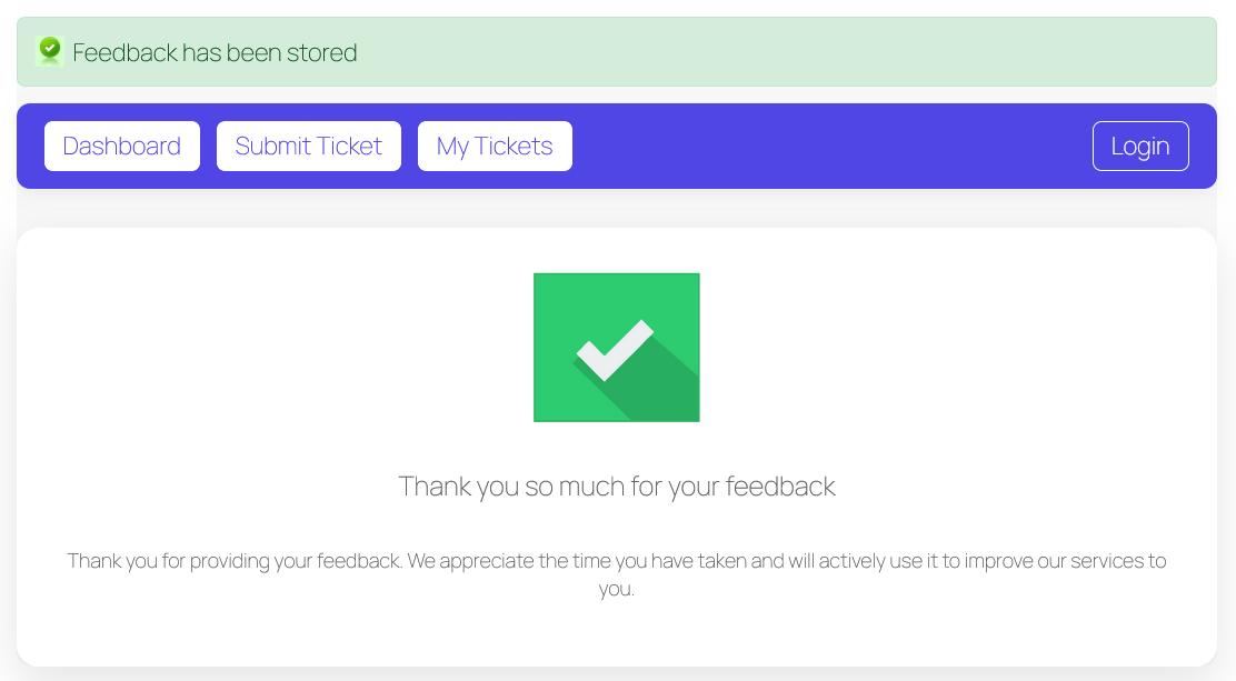 Once a user submits their feedback in JS Help Desk, they are immediately greeted with a confirmation screen that displays a success message. This confirmation page reassures the user that their feedback has been successfully stored and received by the system. The green checkmark icon, along with the message “Thank you so much for your feedback,” provides a clear and positive indication that their input has been acknowledged.