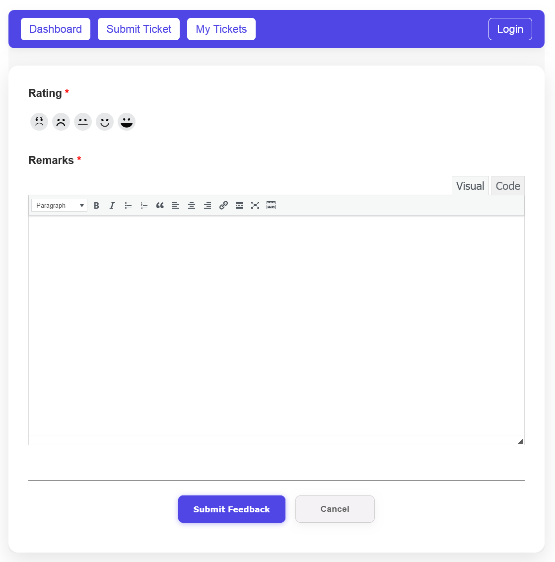 The User Feedback Form in JS Help Desk is a simple and intuitive way for customers to share their experience after interacting with your support team. Once a support ticket has been resolved or closed, users are given the option to rate their experience and provide remarks. This feature plays a vital role in helping your organization measure satisfaction levels and continuously improve support quality.