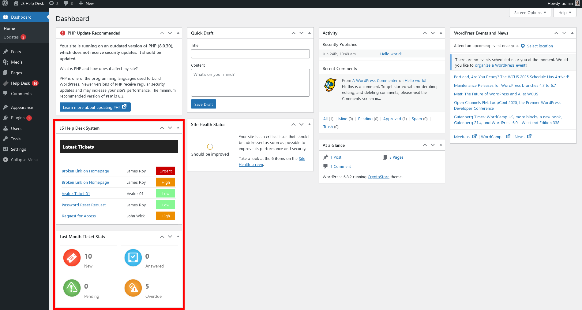On the admin side, widgets are extremely useful for ticket monitoring. A dashboard widget might display counts of Open, Pending, Overdue, or Closed Tickets in real time. This allows admin to see at a glance how many tickets are waiting for them, which ones are urgent, and how their workload is distributed.